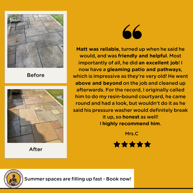 Matt was reliable, turned up when he said he would, and was friendly and helpful. Most importantly of all, he did an excellent job! I now have a gleaming patio and pathways, which is impressive as they’re very old! He went above and beyond on the job and cleaned up afterwards…for the record, I originally called him to do my resinbound courtyard, he came round and had a look, but wouldn’t do it as he said his pressure washer would definitely break it up…so… honest as well!